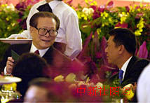 国家主席江泽民在庆祝澳门回归一周年晚宴上同行政长官何厚铧亲切交谈。中新社传真 宗金柱 摄