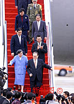 国家主席江泽民与夫人王冶坪在澳门特区行政长官何厚铧的陪同下,于19日下午乘专机抵达澳门机场,出席澳门回归祖国一周年庆典活动,江泽民主要陪同人员钱其琛等同机抵达。中新社传真 满会乔摄