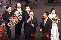 江泽民主席与何厚铧、陈燮阳、孔祥东、莫华伦、林盈盈以及全场观众,齐唱《歌唱祖国》。中新社传真 满会乔 摄