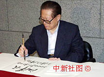 江泽民20日参观澳门博物馆后欣然签名留念。中新社传真 董会峰 摄