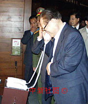 国家主席江泽民在参观澳门博物馆时通过为游客特设的电话听取该馆的录音介绍。中新社传真 董会峰 摄