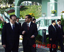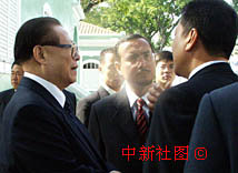![]() 国家主席江泽民21日上午在澳门住宅博物馆听取临时海岛市政局执委会主席、土生葡人马家杰介绍情况。中新社传真 董会峰 摄 |