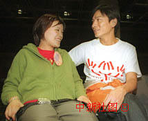 前中国国家女子体操运动员桑兰12月20月在香港出席“展能显艺飞跃千禧”记者会,与刘德华共欢谈。中新社传真邓庆乐摄