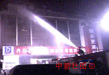 消防人员赶到河南洛阳发生重大火灾的商厦前,奋力喷水救人。中新社图