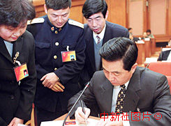 胡锦涛为人大代表们在首日封上签字 2000年3月12日 09:35 ![]()