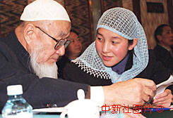 来自甘肃的保安族少女马香梅(右)是出席九届全国人大三次会议的代表中年龄最小的一位。图为她与人大代表、甘肃省伊斯兰教协会会长杨森十四日在小组会上讨论。作者:王丽南