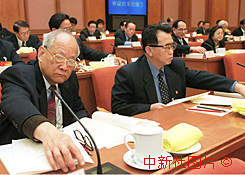 全国人大香港代表吴康民(前左一)在十四日举行的九届全国人大三次会议主席团第三次会议上按表决器。作者:李刚