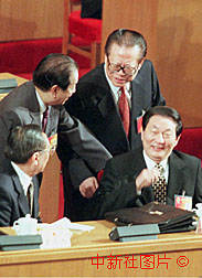 国家主席江泽民(右二)、总理朱镕基(右一)、副总理李岚清(左一)、钱其琛(左二)在九届全国人大三次会议闭幕会上交谈。作者:王丽南