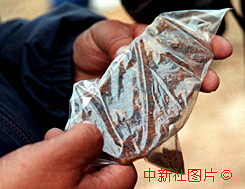 北京考古专家十四日首次公开展示在老山汉墓出土的一件汉代工具“铁锸头”。该件底部有残缺的汉代铲土工具部件“铁锸头”(相当于铁锹前锋),于十三日在考古人员扩展南端墓道,清理古墓填土时被发现。中新社记者:邹宪