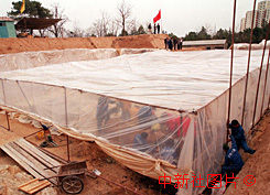 北京市文物局为保护正在京城西郊“老山汉王墓”遗址考古文物不受风吹日晒影响,保持古墓地下的湿度、温度而建起了一个临时塑料大棚,以便突击挖掘汉王墓的外壁。为开掘老山汉墓的墓室,考古队五月将一个更坚固的专业棚。中新社记者:邹宪