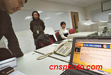 2月5日晚,有“歌坛常青树”美誉的台湾歌手蔡琴在台湾通过长途电话与新浪网友进行聊天。蔡琴还将于2月14日至17日在北京领衔主演的大型音乐剧《天使--不夜城》。图为工作人员在通过电话联系蔡琴,电脑里正显示着有关蔡琴资料的主页。中新社图 陆云 摄