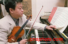 中国国家交响乐团著名小提琴演奏家盛中国,近日将开始新千年全国巡回演出。图为盛中国在家中研究乐谱。中新社记者 张勤 摄