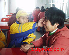 元宵节来北京劳教所看望母亲的孩子,给曾是法轮功练习者的妈妈擦拭泪水。中新社图 王岩 摄