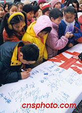 河南省会郑州万余名青少年和各界群众聚集火车站广场,举行“崇尚科学、反对邪教”签名活动,同时郑州市青年志愿者反邪教宣传队宣告成立。中新社图 慎重 摄
