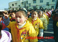 2月14日下午,安徽省繁昌县实验小学举办“相信科学反对迷信”宣誓大会,近千名学生在庄严的国旗下宣誓:相信科学,反对迷信,远离法轮功。中新社图 吴芳 摄