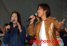 歌星田震(左)二月二十日在香港举行的“向老师致敬2001”活动上演唱。中新社传真 任海霞摄