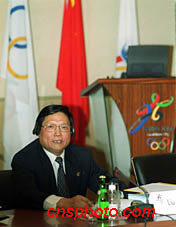 北京奥申委主席、北京市市长刘淇二十一日在北京举行的迎接国际奥委会评估团会议上致词。中新社记者 李刚 摄