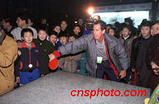 国际奥委会评估团二十二日考察北京椿树园小区,澳大利亚专家西蒙与小学生玩乒乓球。中新社图 赵彤杰 摄