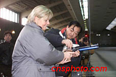 2月23日下午,国际奥委会评估团员到北京射击场考察,国际单项体育组织代表埃尔斯·弗里斯曼在奥运冠军中国著名射击教练许海峰的指导下一试身手。作者:赵彤杰