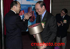 香港邮政署长陆炳泉(中),2月24日在香港文化中心主持香港承办中国“九运会”武术散打预赛小型张介绍会,霍震廷(右)、霍震寰等出席。中新社传真任晨鸣摄