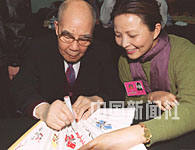 全国政协委员、著名京剧表演艺术家袁世海,在北京参会中为青年委员李羚题写折扇。中新社记者 钱兴强 摄