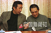 中国著名电影导演冯小宁与张艺谋,十一日参加全国政协九届四次会议文艺组讨论时,相互切磋拍摄手法。中新社记者 刘可耕 摄