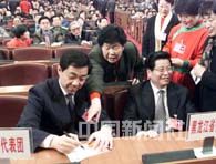 九届全国人大四次会议第五次全体会议十五日上午在北京人民大会堂举行,全国人大代表、辽宁省长薄熙来在会场为代表们签名。中新社记者 毛建军 摄