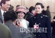 九届全国人大四次会议第五次全体会议十五日上午在北京人民大会堂举行,出席会议的少数民族代表与著名歌唱演员宋祖英合影。中新社记者 毛建军 摄