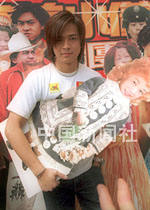 歌星陈晓东19日在香港出席「森美小仪歌剧团」成立仪式,手抱小仪纸版公仔造型。中新社传真 邓庆乐 摄