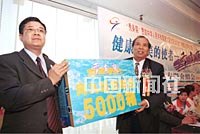 港资晖展食品有限公司日前在广州向第九届全国运动会捐助一百三十万元。这是今年广州首家支持九运会的企业。图为该公司董事长陈溢民(左)向九运会广州赛区集资委员会捐赠物资。中新社记者 梁永强 摄