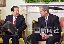 美国总统布什二十二日在白宫会见中国国务院副总理钱其琛时说,他期待着今年秋天到中国访问。中新社图 京华 摄