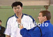 三月二十八日下午,美国芝加哥小牛队助理教练小尼尔森,在北京先农坛体育场对中国男篮新秀王治郅进行了单独训练,大郅的出色表现让小尼尔森惊讶不已。此举是为大郅能尽快了解小牛队的技战术而特意安排的。中新社图