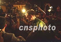 美国驻华使领馆官员席乐高八日凌晨二时许在海口文华酒店出席海南省外事侨务办公室举行的新闻发布会后,面对中外记者包围追问与机组人员第三次见面等情况,再也一言不发。中新社记者 贾国荣 摄