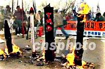 四月七日,韩国市民、学生在首都汉城集会,抗议美国导弹防御系统和日本通过的美化侵略的历史教科书。图为示威群众当众焚烧了美、日两国国旗和用纸糊制的导弹模型。中新社图