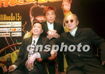 歌星许志安9日在香港出席其「借你耳朵听许志安演唱会」记者会,许志安感谢张耀荣(左)、黄柏高(右)在演艺事业上对他的支持。中新社传真 邓庆乐 摄