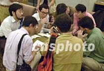 一批日本记者连日在海南省海口文华大酒店整天追踪采访美国军用侦察机撞毁中国战机事件,获得报道信息后往往围在圆桌边共同分享。中新社记者 贾国荣 摄
