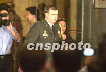 美国驻华使馆国防武官席乐高准将十日晚七时许走出海口文华大酒店,乘中方车辆前去与美机组人员见面。中新社记者 贾国荣 摄