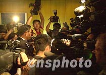 海南省政府外事办公室主任陈辞十一日晚七时在海口文华大酒店举行新闻发布会,宣布中国外长唐家璇接受了美国政府递交的致歉信,引起记者包围采访。中新社记者 贾国荣 摄