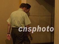 美国驻华使馆武官席乐高准将十一日晚十时四十分在海口文华大酒店新闻发布会上说,现在还不能公布一个机组人员离境的时间表,然后匆匆忙忙从后门离开。中新社记者 贾国荣 摄