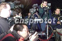 美国驻华大使普理赫十一日晚在北京就美国对撞击事件的致歉信回答中外记者提问,中外记者纷纷抢拍镜头。中新社记者 满会乔 摄