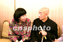 一代围棋名家吴清源与前中国棋手、现在代表韩国出战的芮乃伟女士(左),在第十四届富士通杯世界围棋冠军赛抽签仪式上交谈。中新社图 陶光雄 摄