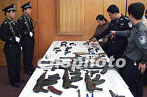 广东省严打整治斗争战果显著,四月以来,全省共破各类刑事案件五千八百起,抓获犯罪嫌疑人六千多名,缴获枪枝一百多支。图为警方展示近日缴获的枪械。中新社图 梁永强 摄