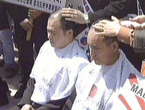 近日,日本文部省通过美化侵略的历史教科书以来,韩国各界反应强烈。全国各地不断有游行、焚烧日货的抗议活动。图为汉城民众当众剃成光头以示抗议。韩国民众把头发看作先人所赐,只有非常愤怒、失望时才会剃光头。