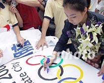 广州中山大学、暨南大学等十所高校十八日在中山大学联合举行“华南万名师生支持北京申奥巡回签名活动首签式,中国奥运冠军刘璇在场签名。中新社记者 罗仰明 摄