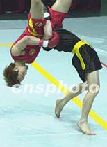 中国“九运会”武术散打预赛4月18日在香港伊利沙白体育馆开赛,56公斤级的江西名将蔡兵荣(黑)以绝对优势战胜上海队的吴师保,晋级十六强。中新社传真 任晨鸣 摄