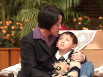 被美国军用侦察机撞毁而牺牲的中国飞行员王伟的妻子阮国琴,二十日含泪怀抱儿子在北京人民大会堂参加中国党政军领导人的会见。