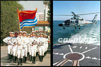 左为海军仪仗队,右为舰载直升机携带反潜鱼雷起飞攻击演练
