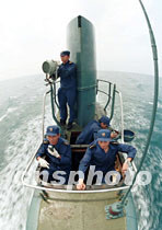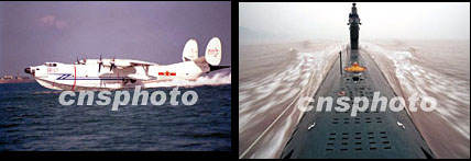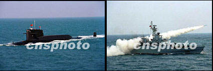 左为中国战略核潜艇,右为导弹驱逐舰发射反舰导弹