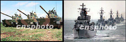 左为海军陆战队两栖坦克,右为导弹驱逐舰和导弹护卫舰组成的特混编队