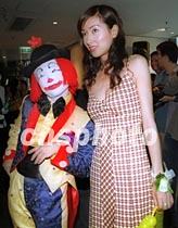 影视红星杨恭如25日出席颁赠「美之标本」体态大奖,与会场内表演魔术的小丑合照。中新社图 邓庆乐 摄